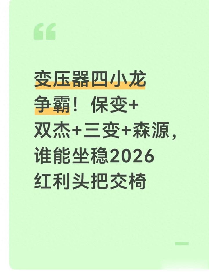最后,想和大家探讨两个核心问题:在变压器四小龙中,你认为谁能真正坐稳2026年的红利头把交椅?除了这四家,你还看好电网设备板块的哪些低估值高潜力标的? 欢迎在评论区留言交流,一起挖掘变压器赛道的优质机会!